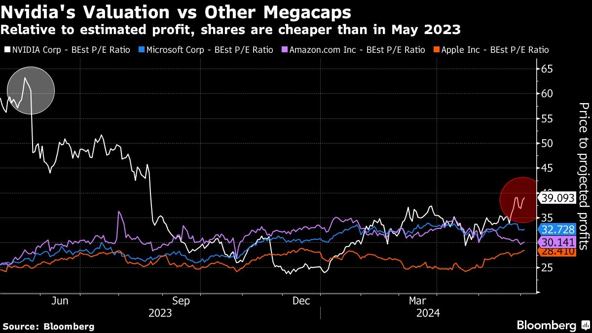 Nvidia 주식은 향후 12개월 동안 예상되는 이익의 39배로 상대적으로 비싸지만, 2023년 5월 수익 보고서 이전에 거래되었던 배수인 60배보다 훨씬 저렴합니다. 비율 변화는 주식보다 훨씬 빠르게 상승하는 분석가의 이익 추정치의 함수입니다. Jonestrading의 수석 시장 전략가인 Michael O'Rourke는 이는 Nvidia가 미래 수익의 31배에 달하는 Microsoft Corp.와 같은 다른 거대 기술 기업에 비해 매력적이라고 말했습니다.