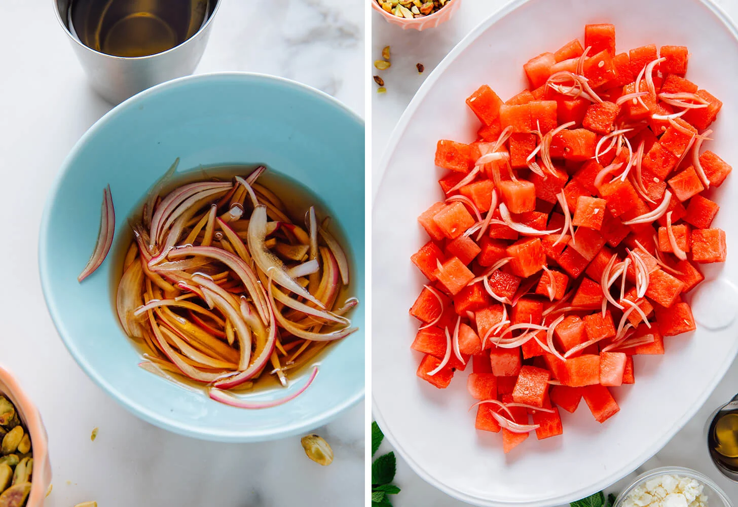 - 큰 접시나 얕은 서빙 볼에 큐브로 자른 수박을 펼치고, 그 위에 절인 양파를 넣고 남은 식초를 샐러드 위에 뿌려줍니다. 그 위에 페타 치즈와 피스타치오를 뿌립니다.