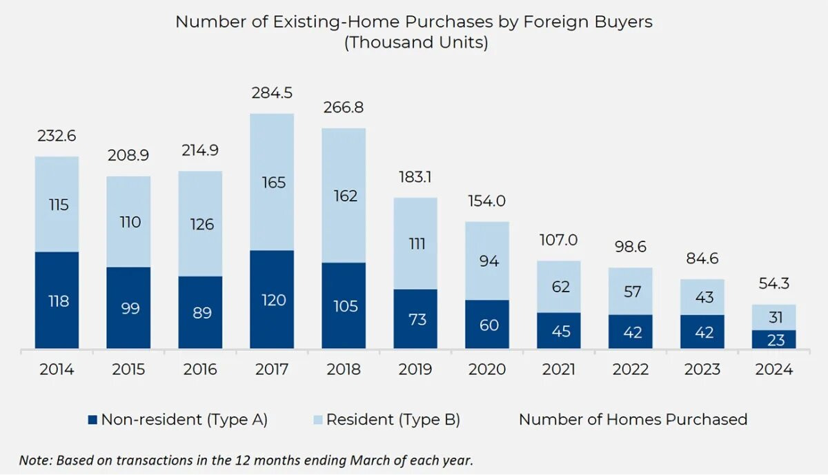 전체 기존 주택 구매자의 28%가 해외 매수자 거래에서 차지하는 비중은 전체 현금 판매의 절반에 달했습니다. 비거주 외국인 매수자(68%)가 거주 외국인 매수자(36%)보다 현금 매수를 더 많이 했습니다. 캐나다(69%)와 중국(68%) 매수자의 3분의 2 이상이 현금 매수를 한 것으로 나타나 상위 외국인 매수 국가 중 가장 높은 비중을 차지했습니다.