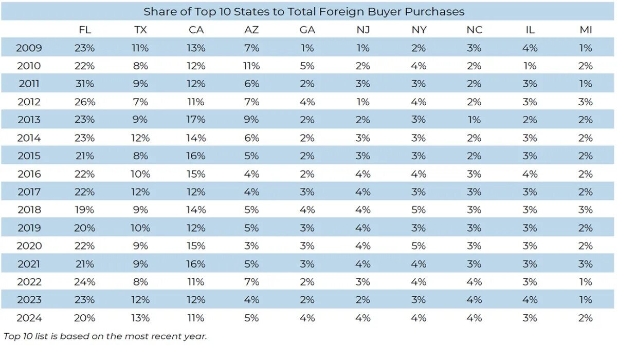 플로리다는 16년 연속으로 전체 해외 구매의 20%를 차지하며 해외 구매 1위 자리를 지켰습니다. 텍사스(13%)와 캘리포니아(11%)가 각각 2위와 3위를 차지했고, 애리조나(5%), 조지아, 뉴저지, 뉴욕, 노스캐롤라이나(각 4%)가 뒤를 이었습니다.