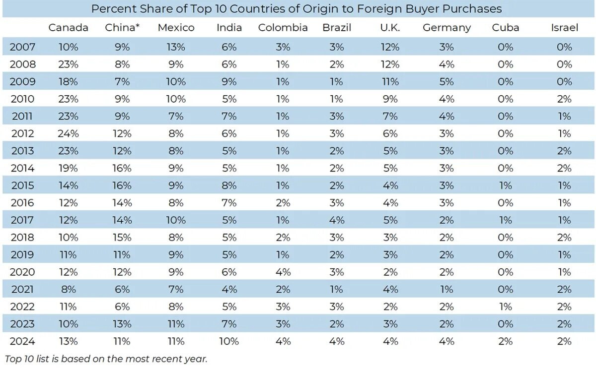 미국 기존 주택의 외국인 매수자 구매 점유율에서 캐나다는 13%로 다른 국가에 비해 앞섰으며, 그 뒤를 이어 중국과 멕시코(각각 11%), 인도(10%)가 뒤따랐습니다.