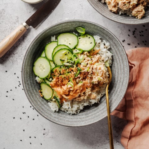 - 그릇에 참치를 담고 밥, 얇게 썬 오이, 파를 더 얹으세요. 기호에 따라 참깨와 바삭하게 볶은 양파를 얹고 매콤한 마요네즈를 곁들여 드세요.