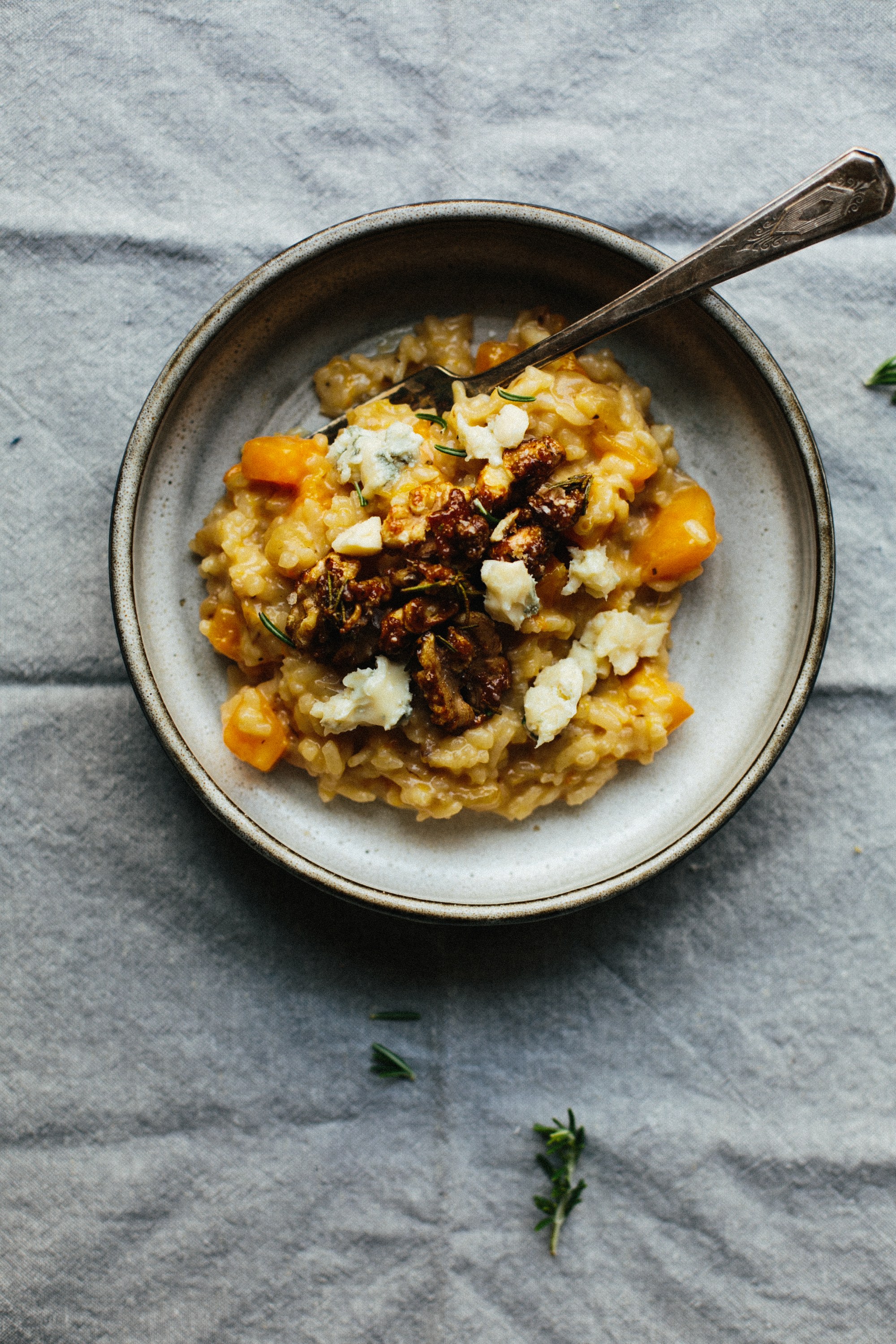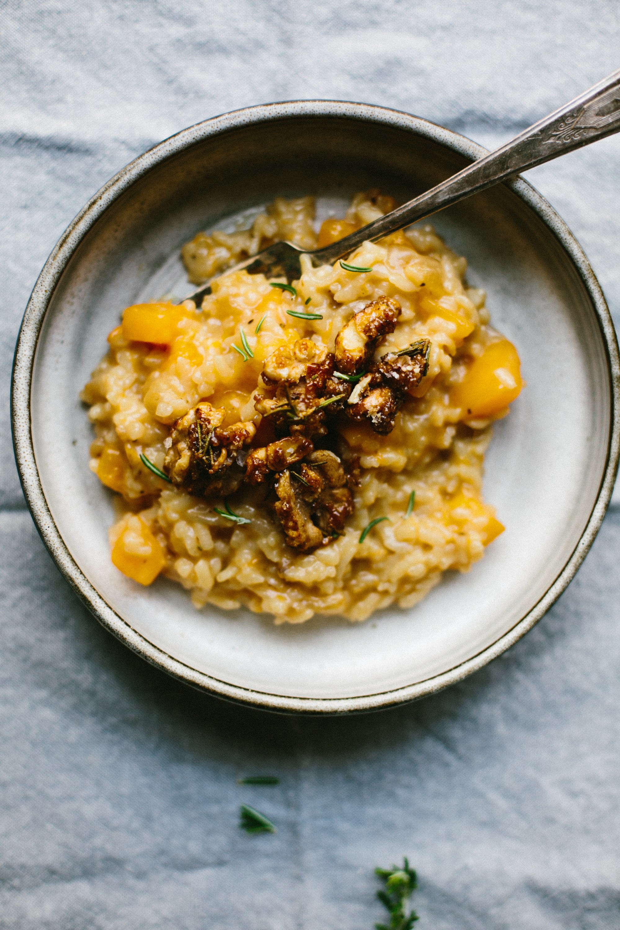 버터넛 스쿼시와 설탕에 절인 로즈마리 호두를 곁들인 오븐 구운 리조또