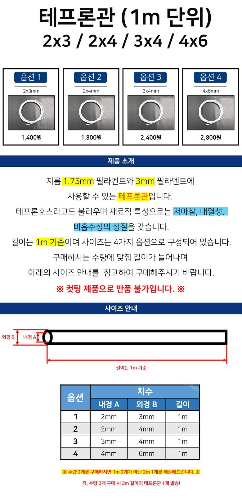 SMART3D PTFE 테프론관 호스 로드 모음 Teflon Pipe 3D프린터 (필라멘트 1.75mm 3mm용) 2x3 2x4 3x4 4x6 mm