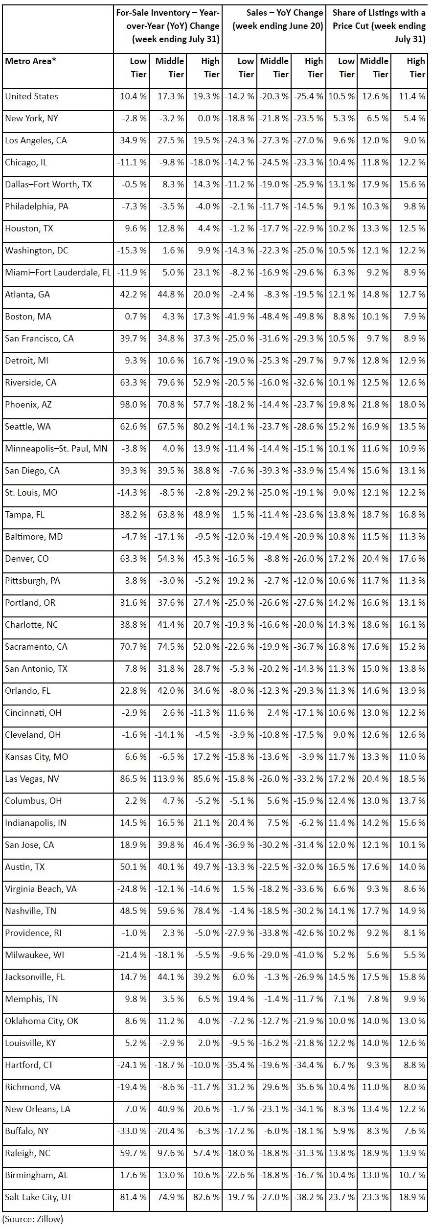 7월 말 주택 시장의 가장 비싼 1/3의 재고는 전월 대비 11% 증가했으며 전년 동기 대비 19.3% 증가했습니다. 유사하게, 중간 1/3의 재고는 전월 대비 12.7%, 연간 17.3% 증가했습니다. 재고는 최저가 1/3에서도 증가하고 있지만 전월 대비 11.2%, 전년 동기 대비 10.4%에 불과합니다. 2021년 같은 기간 동안 가장 비싼 계층의 재고는 가장 비싼 집의 거의 두 배 비율로 매월 증가했습니다.