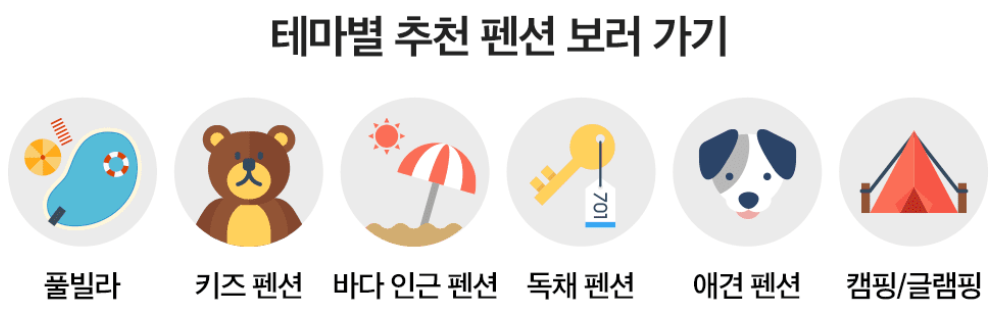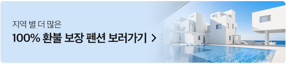 지역별 테마별 펜션 상품 가격 하단에서 100% 환불 표기를 확인하세요.