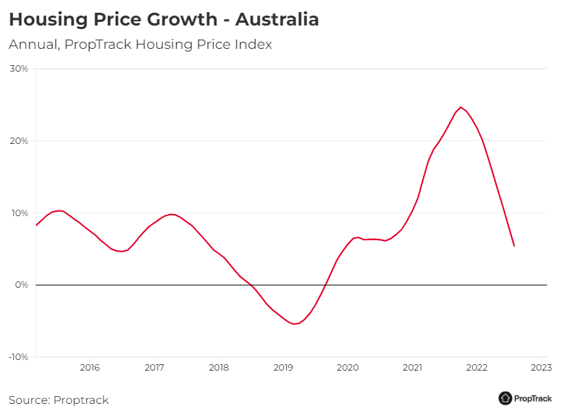 8월 PropTrack의 주택 가격 지수를 보면 전국 주택 가격 상승률이 지난 10월 정점에서 계속 하락했음을 알 수 있습니다.