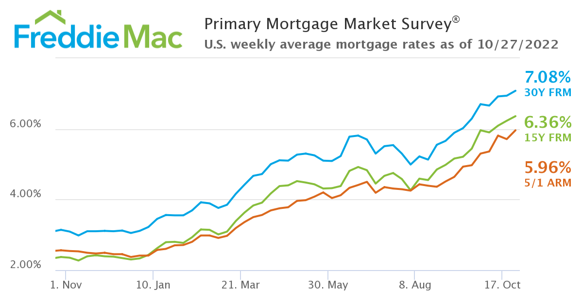 - 30년 고정 모기지 금리는 2022년 10월 27일 현재 평균 7.08%, 평균 0.8포인트로 전주 평균 6.94%보다 상승했다. 1년 전 당시 30년 FRM은 평균 3.14%였다.